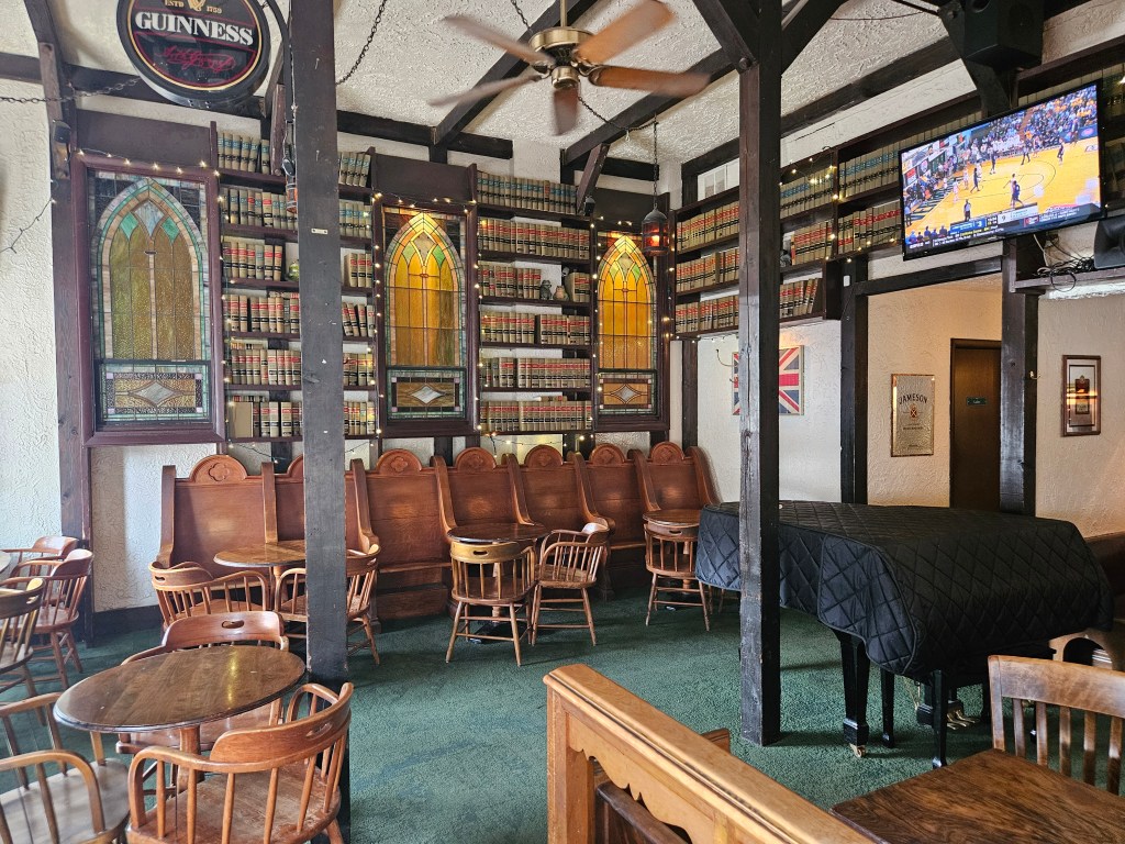 After getting approval from the city, a wood carved sign of a red-tongued toad was placed above the door. Approval was needed as there had been some concerns that it could be a fire hazard. The sign, similar to those you would find hanging above pubs in England, was the product of a high school woodworking class in Neola, Iowa. Inside the pub it was Tudor-esque with its wood beams and trim across the ceiling. Some of Rusty’s design touches included law books obtained from the Antiquarium Bookstore, a hard carved fireplace mantel, stained glass and handcrafted tiles from Mexico among other items. Seating consisted of oak pews from Girls Town and benches from the county courthouse.