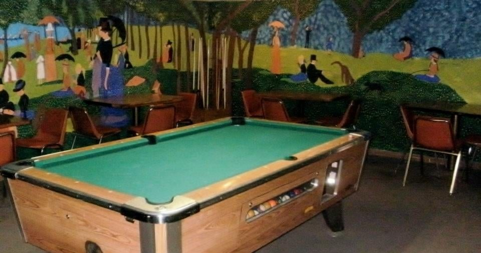 By the time the 1980’s rolled around, his son Tom had taken the reins of Bud’s bar. I read that Tom was a literary conversationalist that could rap about your favorite authors. My first thought upon reading this was that of a young Brian Flanagan, the last barman poet, from the movie Cocktail. While Bud Olson’s didn’t come close to the swank places where Tom Cruise’s character would sling drinks, the Olson family embraced the diviness of the bar. From cheap drinks to the long hours to the mish mash of decor which included a library, barber chair (perhaps a tribute to Smitty years earlier), an ancient-looking St. Patrick statue to the Norwegian monks around a skylight above the bar. The most surprising though was the mural in the back room depicting George Seurat’s “A Sunday Afternoon on the Island of La Grande Jatte”. You would recognize it as the painting that Cameron stared at in Ferris Bueller’s Day Off.