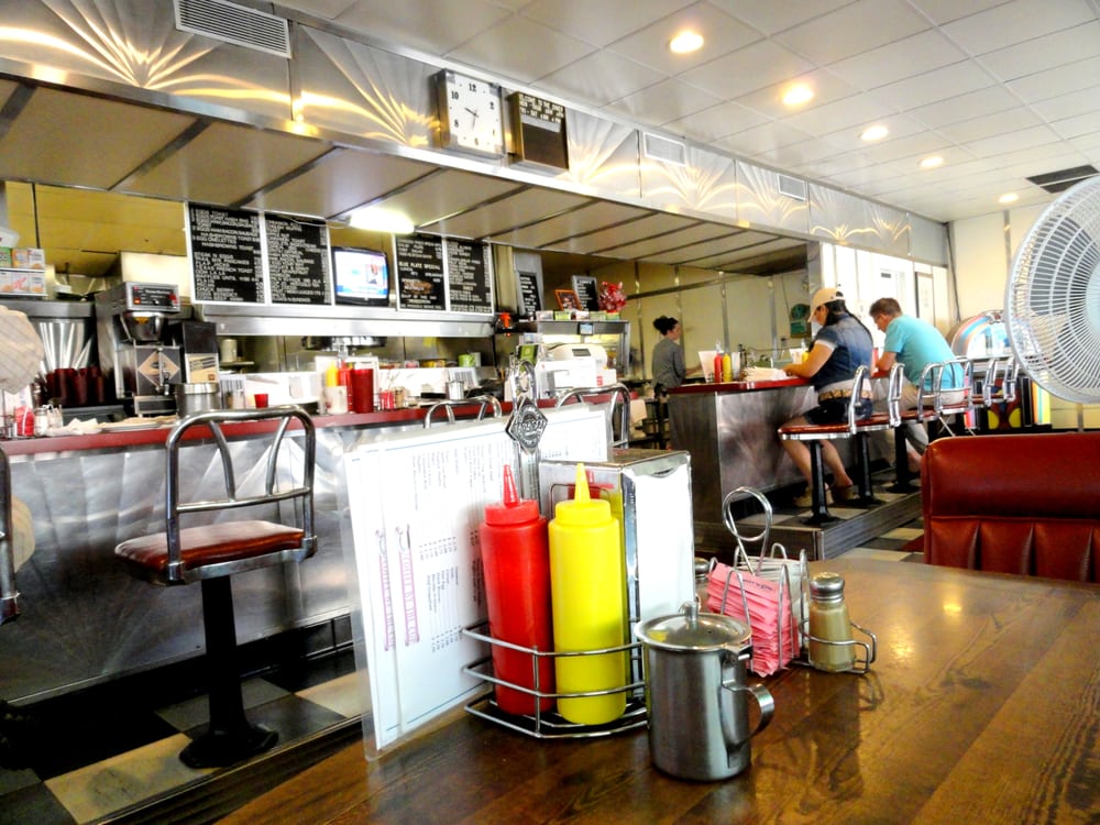 To capitalize on the opportunity, they built the restaurant themselves and designed it in the style of an old-fashioned roadside diner. The exterior featured a neon sign and a clock above the entrance, while the interior included a black-and-white tile floor, red leather booths, barstools, chrome trim, and an old-fashioned cash register.
