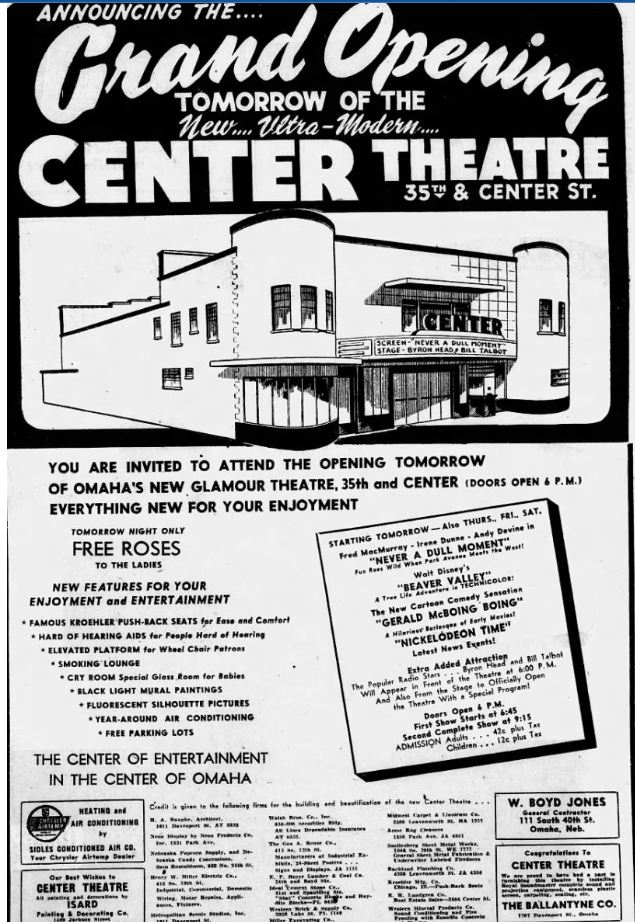 Continuing with our exploration of the small buildings in what was once known as the West Center District. The Center Theater on 35th was the last of the neighborhood theaters to be built in Omaha. Opened by theater mogul Walter Creal, the 725-seat theater opened its doors in 1951. Creal’s other theater holdings included the Suburban, Military, Beacon and North Star among others. Located in the West Center District, it was strategically placed between the Hanscom Park and Field Club neighborhoods. The exterior was made of both light and dark brick and had a marquee made of stainless steel. Inside it was the first theater in Omaha to have a reverse pitch auditorium floor designed to reduce neck strain for those sitting in the front rows. Other notable features included space for wheelchairs, a smoking lounge and an enclosed crying room for mother’s and their babies. On the walls were large murals including one with an Old West theme. The second floor contained a four room apartment for the theater manager in addition to office space. The first tenant was a dry cleaner which operated out of space on the first floor. Opening night shows included “Never a Dull Moment” and Disney’s “Beaver Valley”. The building continued to operate as a theater movie until health problems forced Walter to sell it in 1974.