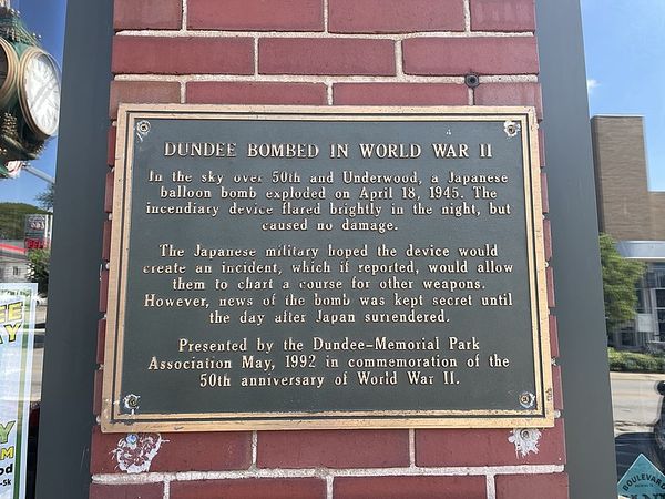 As you enjoy a walk through the Dundee business district, you may notice an interesting plaque that describes an event in which a Japanese balloon bomb exploded above the Harte Block. The explosion took place above the intersection of 50th and Underwood Avenue on April 18, 1945.