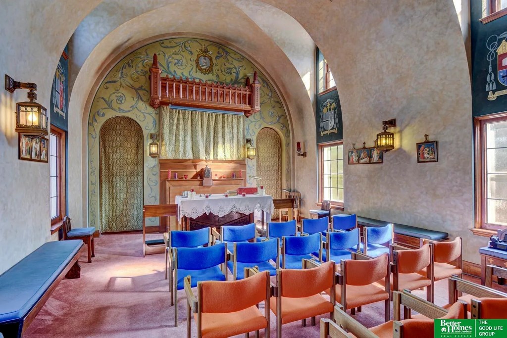 By 1937 Rufus and his wife passed away and it was sold to the Archdiocese of Omaha. Shortly afterwards, UNO would begin building its campus to the south. They reconstructed the north wing which now included a large library in addition to a rare collection of medieval monastic books, a chapel (with vaulted ceiling using the Coats of Arms of the Omaha Bishops hand painted by a German artist) and a dormitory on the top floor. The Archbishop was responsible for many of the European and religious details added to the home including the hand painted three panel atrium door on the second floor. The elevator was added in 1967 after its current Archbishop resident had his leg amputated.