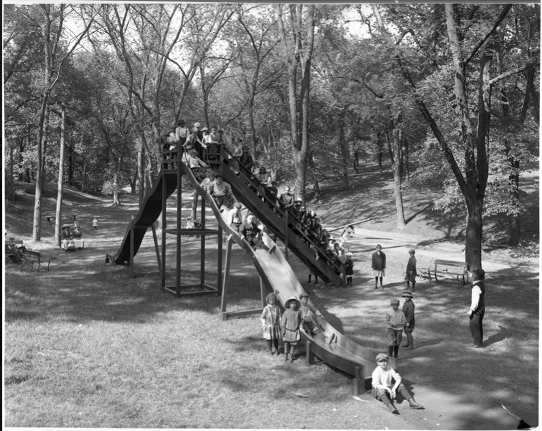 At some point, the city banned dance parties and removed the dancing platform. At least they added a nice pavilion which had burned down three years later. They replaced it with an even larger two-story open-air structure that included a wrap around porch that overlooked the lagoon. The pavilion also included caretaker quarters on the second floor. Fortunately, the city didn’t ban ice skating. In fact, they encouraged it by renting out skates. The lagoon was also popular for fishing. Other features included two metal slides that were hitched together, a merry-go-round and teeter totters as well as other items.