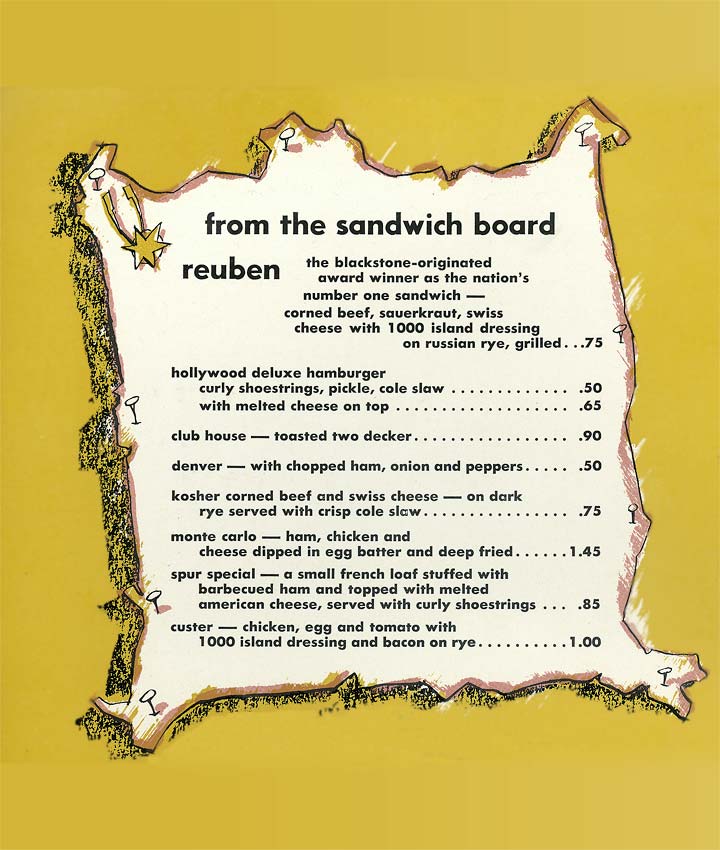 While some people may say that the sandwich was invented in NYC by Arnold Reuben as far back as 1914, there’s no proof. Also, his version of the sandwich differs quite a bit from the one we’ve grown to love over the last 98 years. The earliest proof of the sandwich appearing on the east coast is from a recipe in a cookbook from 1941. Meanwhile, the Douglas County Historical Society found a printed menu from the Blackstone offering the sandwich for $0.40 in 1934.