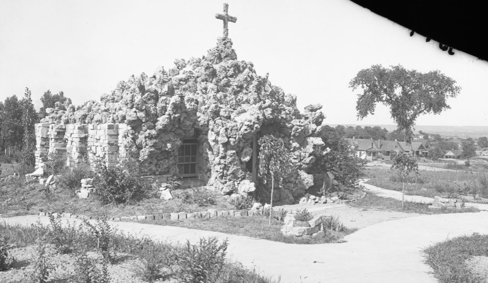 One year later he found his way to Nebraska where he went to work in Beatrice for a time. He was then hired by the Sisters of St. Francis in 1910 to build a grotto next to St. Joseph’s Hospital on 10th and Castelar Streets. The sisters received a large sum of money after John A. Creighton, a longtime supporter of the hospital, passed away in 1907. The money allowed for rapid expansion of the hospital including a new addition and renovations to the existing building.