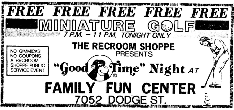 Just a few months earlier the 20,000 sq ft building near the intersection of 72nd and Dodge became available. Built in 1952 for Safeway and most recently housed Famous Footwear, it proved to be the ideal location. To this location he installed two 18-hole golf courses and 60 arcade games including Ms. Pac Man, Donkey Kong, Asteroids, and Space Invaders.