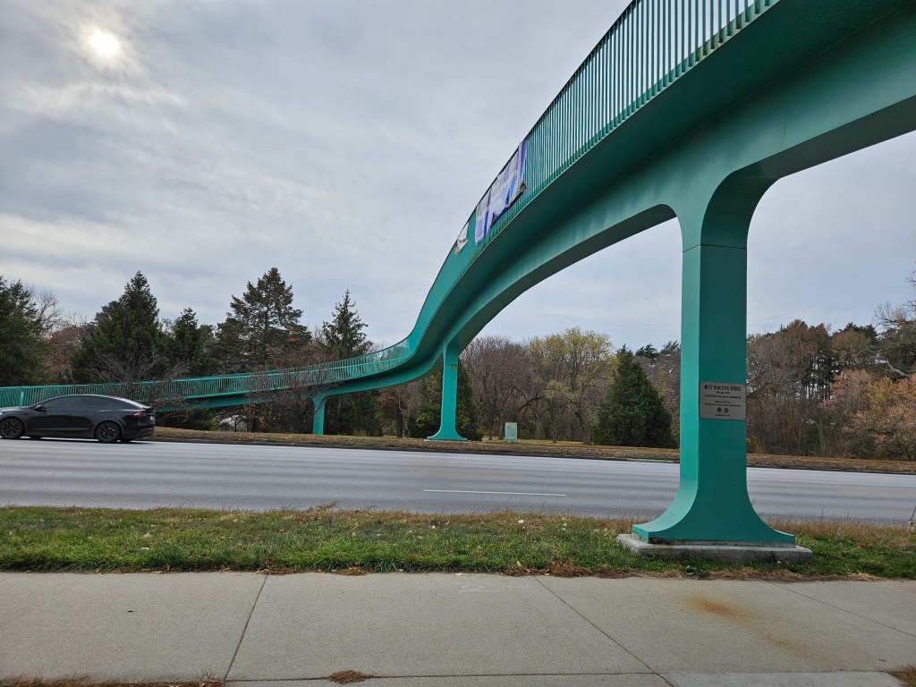 After the war ended in 1945, the student population in Omaha exploded as servicemen returned home. To address safety concerns of children having to cross busy streets in the growing city to get to school, the city began building pedestrian bridges. The first was built at 42nd and Grover. Parents of St. Margaret Mary’s promoted the idea of building a similar bridge over Dodge St. The design with its flowing S-curved steel structure was unlike anything the city had ever seen. The city planned to coordinate the construction of the bridge with the widening of Dodge to five lanes. The bridge opened in 1968 and was named Most Beautiful Bridge by the American Institute of Steel Construction a year later. In 2004 it was designated as an Omaha Landmark. Of more than dozen pedestrian bridges built during that time, the bridge at Memorial Park remains the most utilized.