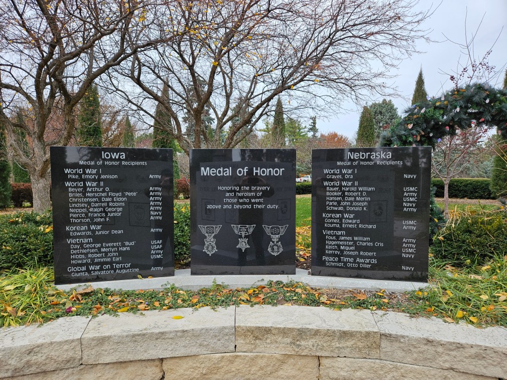 With its entrance at 60th and Underwood Ave, the memorial was dedicated in a ceremony featuring President Harry Truman on June 5, 1948. In his remarks, he said “The men who gave their lives did so because they believed, as I believe, in an ideal. That ideal is peace in the world for all of the world.” The park symbolizes the community’s gratitude to Douglas County veterans and those killed while fighting for freedom during WWII. Since then it was broadened to recognize the service and sacrifices of veterans in other conflicts.