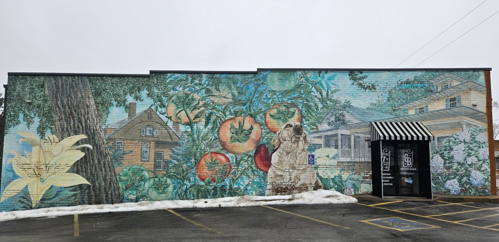 With mural fading and paint chipping, 12 years later muralist Craig Lee began prepping the site to paint a new neighborhood themed picture on the wall. Completed six months later, it featured nearby houses, trees, blooming plants and his pup Georgia. He also applied a clear acrylic coat designed to easily remove graffiti. Craig’s other work can be found around town including inside Vis Major next door.