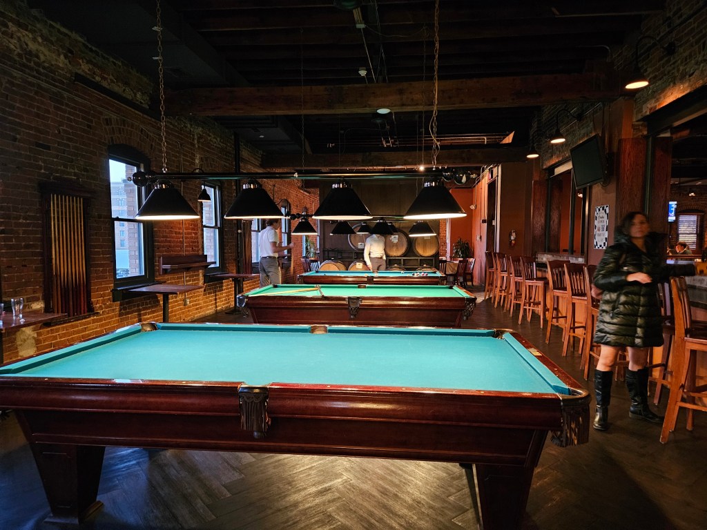 Accessed from a steel staircase, the second floor offers a bird’s eye view of the main floor. This floor resembles an upscale pool hall with multiple pool tables, another bar in addition to seating for another 145. Out front along the corner of 11th and Jackson is one of two outdoor patio spaces. It was this space in front of the building that thirsty horses once got water from a trough. The second patio is on the northeast corner of the second floor. The total cost to renovate the 20,000 sq ft building was $1.4M which the owners felt was necessary in order to restore the building and to add character and flavor to the Old Market.