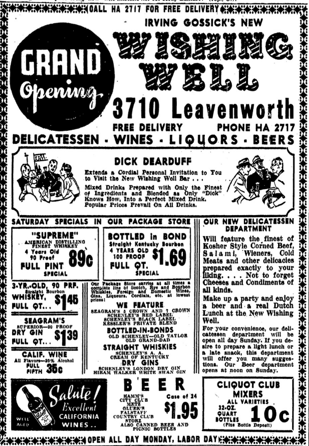 After opening Mister Toad in 1970 with the help of business partner Artie Abariotes, Rusty Harmsen turned his attention to midtown. Built in 1931, the building at 3710 Leavenworth had been the home to Canfield Cleaners before Irving Gossick turned it into the Wishing Well Lounge in 1940. Artie was the co-owner of the Wishing Well when the business was put for sale. Rusty purchased the bar with business partners Tom Williams and Bill Pomeroy.