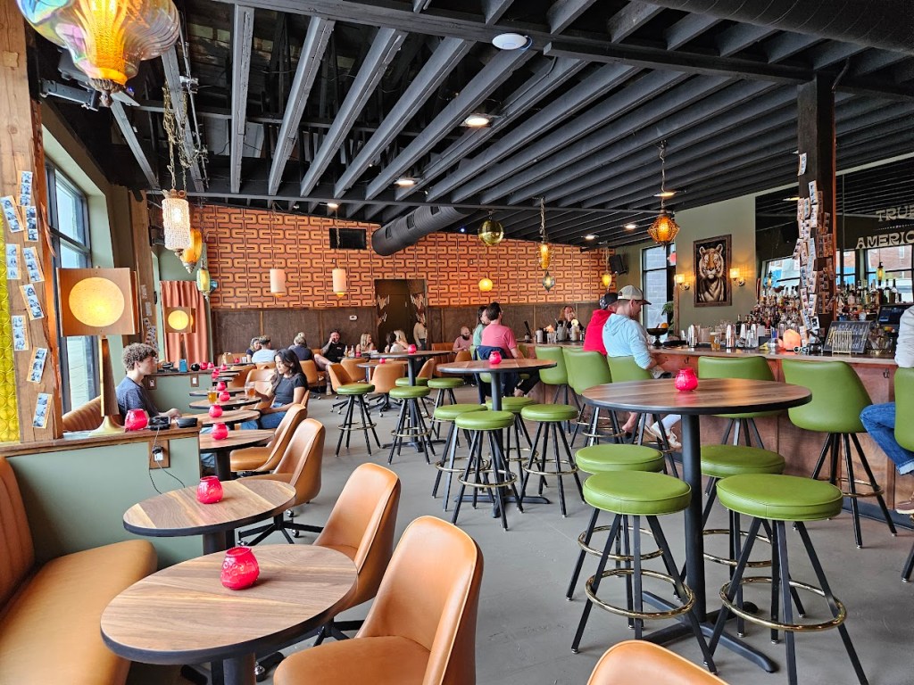 The following year the bar opened a tiny kitchen that served hamburger reubens which substituted corned beef for ground beef in addition to a standard hamburger, curly cue fries and daily specials. It even provided live music on the weekends which included country, rock, jazz, pop and standards. Unfortunately, a two-alarm fire in 1976 caused extensive damage to the interior requiring it to be renovated. Whatever decor was inside at the time was destroyed. When it reopened after the fire the stucco walls were painted tan with green and black stripes everywhere while the decor was art deco. A huge photo of Harry Truman was on display in the back room.