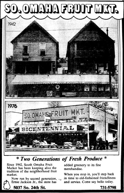 While the assessor shows the building was constructed in 1943, Omaha Wholesale and Retail Feed Company was operating from this address at 5037 S 24th Street as far back as 1930. The business names changed over the years and didn’t become C & M Produce until 1937 one year before this photograph was taken during the Great Depression. C & M was owned by Clifford Mansmith. One of the houses behind the storefront caught on fire in 1942. It’s likely the fire caused both houses and the storefront to be demolished. The new building was constructed in 1943 at which point Ernie Jackson opened the South Omaha Fruit Market which continued until 1977.