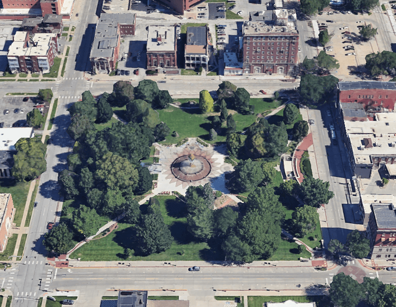 Google Earth view of Bayliss Park at 100 Pearl Street in Council Bluffs. The fountain is in the center with the dome to its left.