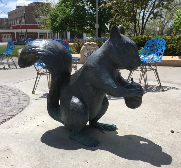 After obtaining feedback from the residents, the city commissioned nationally renowned sculptor Hatcher Browner to design the new fountain in addition to other features within the park. His design included a new 22-foot fountain called “Wellspring” with eight arching nozzles, a ring of 24 water spray jets, upper and lower pools and a sculpture. Other features of the renovated park include a permanent raised stage that was incorporated into the west side of the plaza. It location allows the audience to be seated under large trees with their backs to the setting sun. Hatcher also created the dome that sits over the top of the pavillion as well as the six black squirrel sculptures that sit along the east side of the plaza. The park also has an interactive splash pad on the north side in addition to monuments and markers honoring local veterans.
