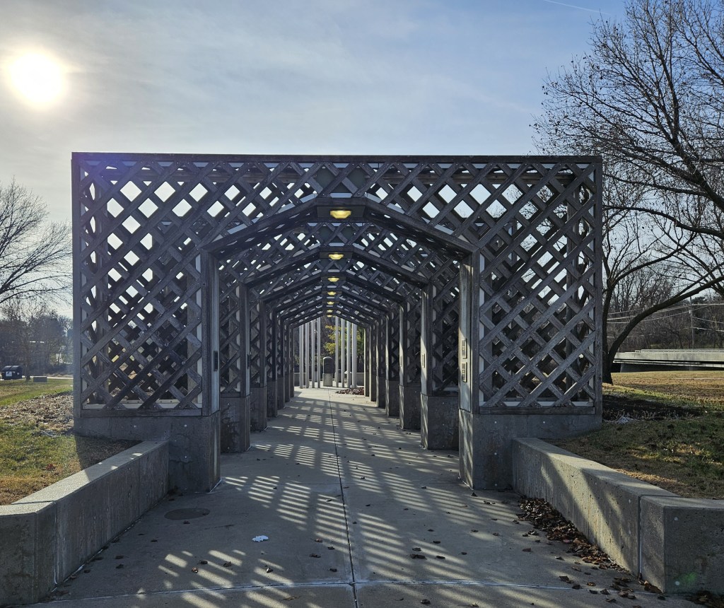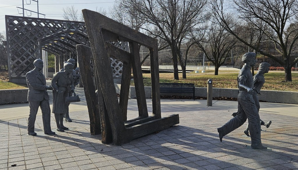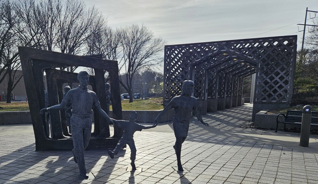 The foundation selected a site that sat on two acres of city owned land that had high visibility on 105th and Pacific. Omaha’s park opened in 1992 and represented the psychological journey of both cancer patients and their supporters. The park has eight life-sized bronze statues that passed through a maze. The first five figures show a range of emotions on their faces including fear, hope and determination. The last three figures come out of the other side of the maze happy and laughing representing successful treatment. The park also contains 14 tubes that are 24 feet high and that cast light into the sky. There are also 14 plaques that display both messages of hope and suggestions for those coping with cancer. On the far end is a computer which originally allowed people to input a specific type of cancer to see the names of local individuals who have survived that type of cancer for at least five years. I’m not sure whether the computer still works today.