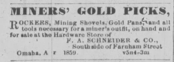 Just one year after Omaha City was established, the son of German immigrants moved from Canton, OH and opened a general store that remains open today. Located at 213 Farnam in Jobber’s Canyon, Frederick Schneider’s store was easily identified by a massive sign that resembled an ax. The zinc sign was transported from St. Louis to Omaha by steamboat. His store sold essentials including food, clothing, hardware, gold pans, scales and oxbows among other items to wagon trains heading west. His customers read as a who’s who of Omaha history including the Kountzes, Dodges, Farnams and Creightons.