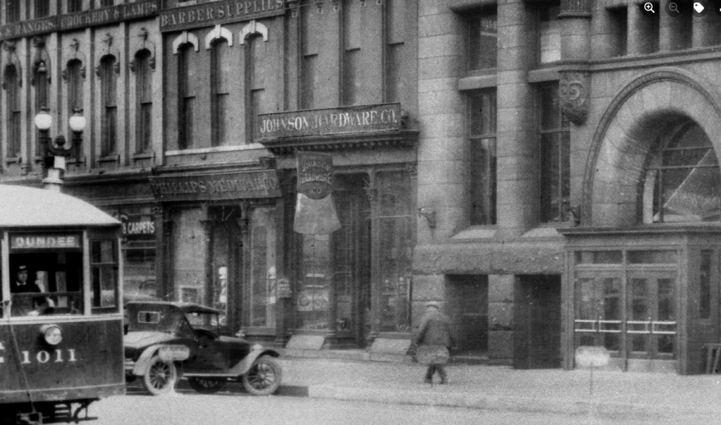 After selling his store to David Bowman in 1884, Frederick bought an acreage in San Jose, CA and relocated his family. By that time, the store moved west to 1217 Farnam St. Its new owner also moved the ax sign to the new location and installed it above the entrance. David operated the business until his death in 1894. That same year Lucien Pettengill, H. M. Johnson, C. W. Johnson and G. W. Wilmoth established Johnson Hardware at which point they bought the general store. They repainted the ax sign so that it displayed their business name. The company operated out of 1217 Farnam until 1942 when they moved a few doors east to 1211 Farnam once that space became available.