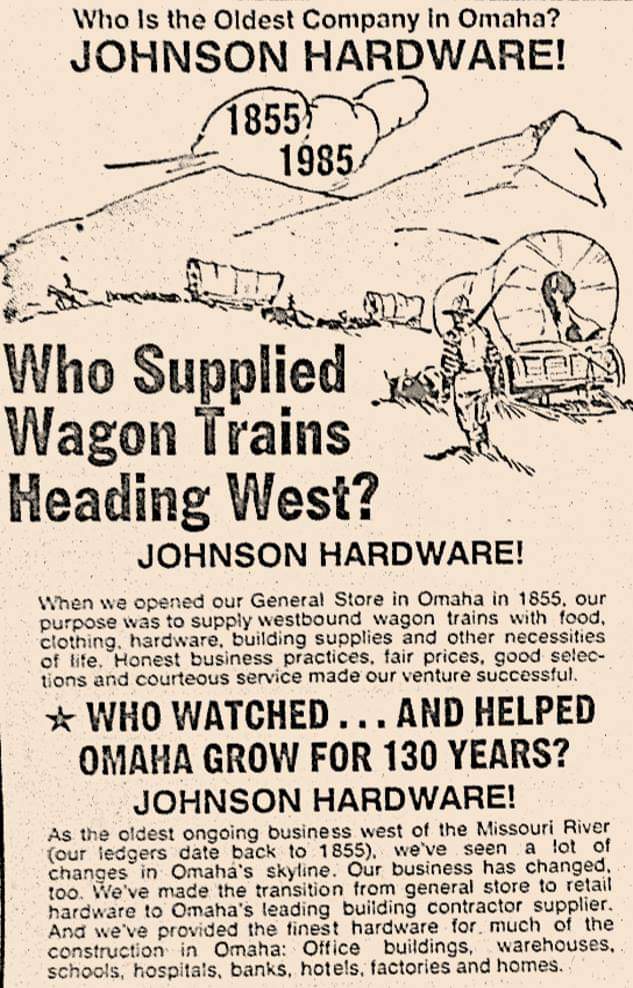 Today Johnson Hardware is the oldest business in Omaha, Nebraska and possibly west of the Missouri River with roots dating back to 1855 with the opening of F. A. Schneider’s storefront in Jobber’s Canyon. While both N. P. Dodge and Weitz Company were founded the same year, each was established in Iowa before moving to Omaha.