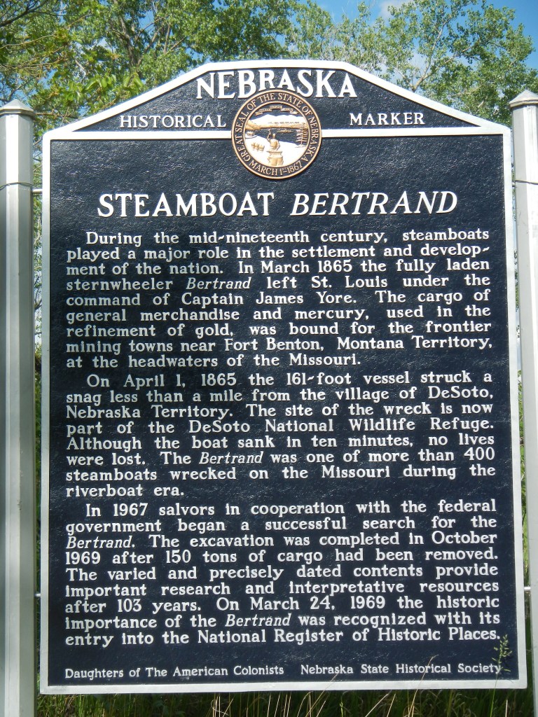 While en route to the Montana Territory in 1865, the Bertrand steamboat sank in the Missouri River after hitting a submerged log. It was quickly covered in mud creating a time capsule of Civil War-era material. The boat and its cargo was rediscovered in 1968. Over 500,000 items were excavated from the wreck site which was uncovered from underneath 30 feet of mud. They found a number of items needed for the new territory’s gold mines, logging camps, farms and households. In addition to tools and equipment, food and clothing were discovered. Many of the items were in excellent condition. Apparently insurance company divers removed most of the mercury and other valuables soon after the ship sank. The Bertrand is listed on the National Register of Historic Places. You can visit the pond where the hull of the steamboat lies buried.