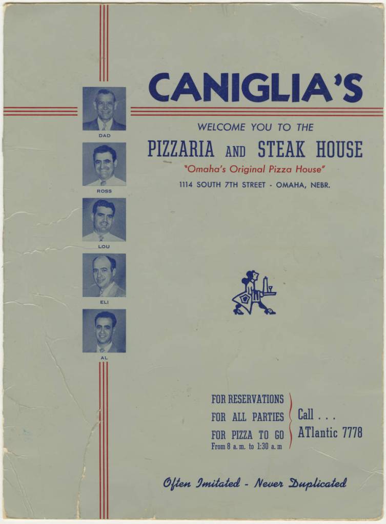 Caniglia’s Pizzaria and Steak House menu courtesy of Omaha Public Library.