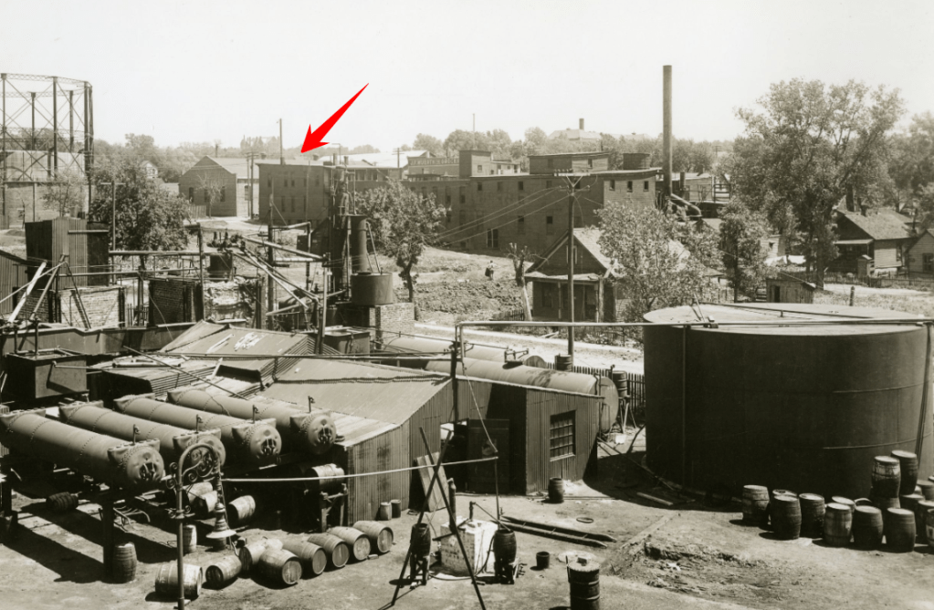 1924 Durham Museum photo of the gas works on 20th Street. I believe the building that would become Piccolo’s is where the arrow is pointed to. Piccolo’s would eventually had additions build on its north, south and west sides while the the gas works would become Lynch Park.