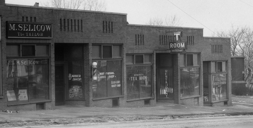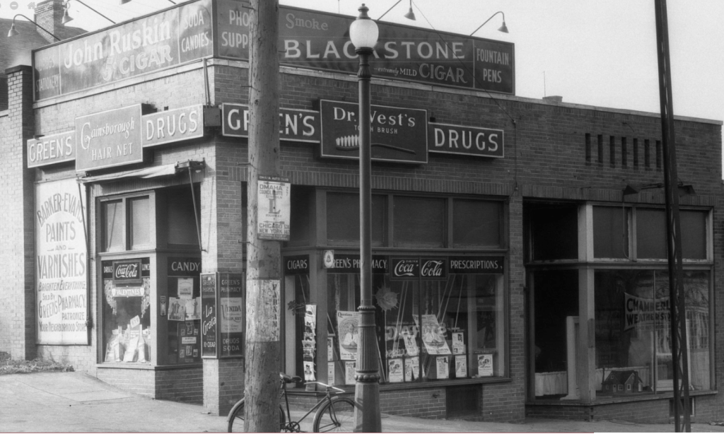 Then (1930): Dundee Plumbing, Cafe, Cleaners, Green’s Pharmacy, M. Selicow Tailer, West Farnam Barber Shop, Mrs. Noble’s Tea Room, Restaurant and Delicatessen.