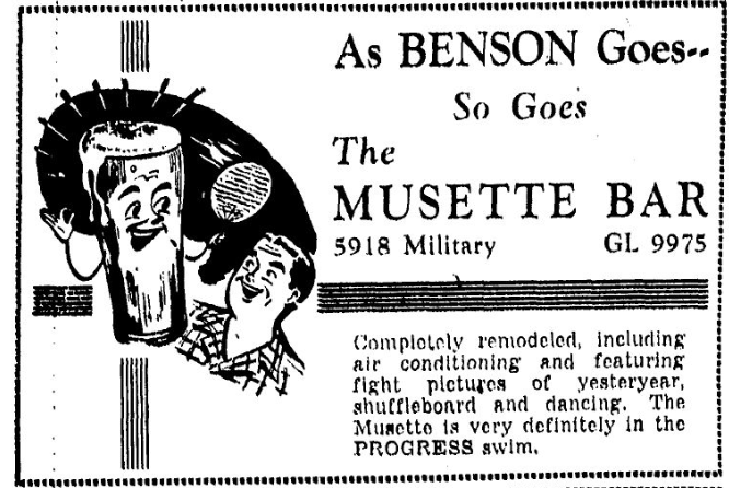 It started its long life as a bar in 1935. Until 1946 it had different owners and operated under various names including Benson Buffett, Hayes Bar and Trudy’s Inn. After Frank took over, it was referred to as the World Famous Frank’s Musette Bar. He renovated the bar in 1949 by replacing the lighting, seating, flooring and decor. One thing that didn’t change, he said, was the bartender and the same old friendly atmosphere. By this time, sports bars were getting started and the Musette played the “sports of yesterday” every Friday night. The bar also offered recreation in the form of shuffleboard of which Frank was an avid player and league member. The bar also advertised music and dancing which were likely the inspiration for its name.