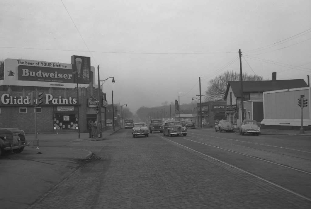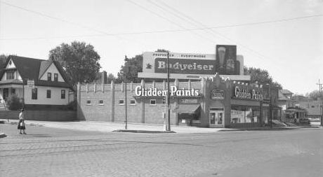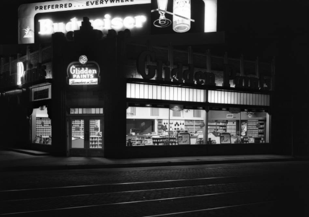 1949 Durham Museum photos of Glidden Paints. The first picture is looking southwest from St Mary’s Ave where it intersects with Leavenworth. The second photo is inside the store.