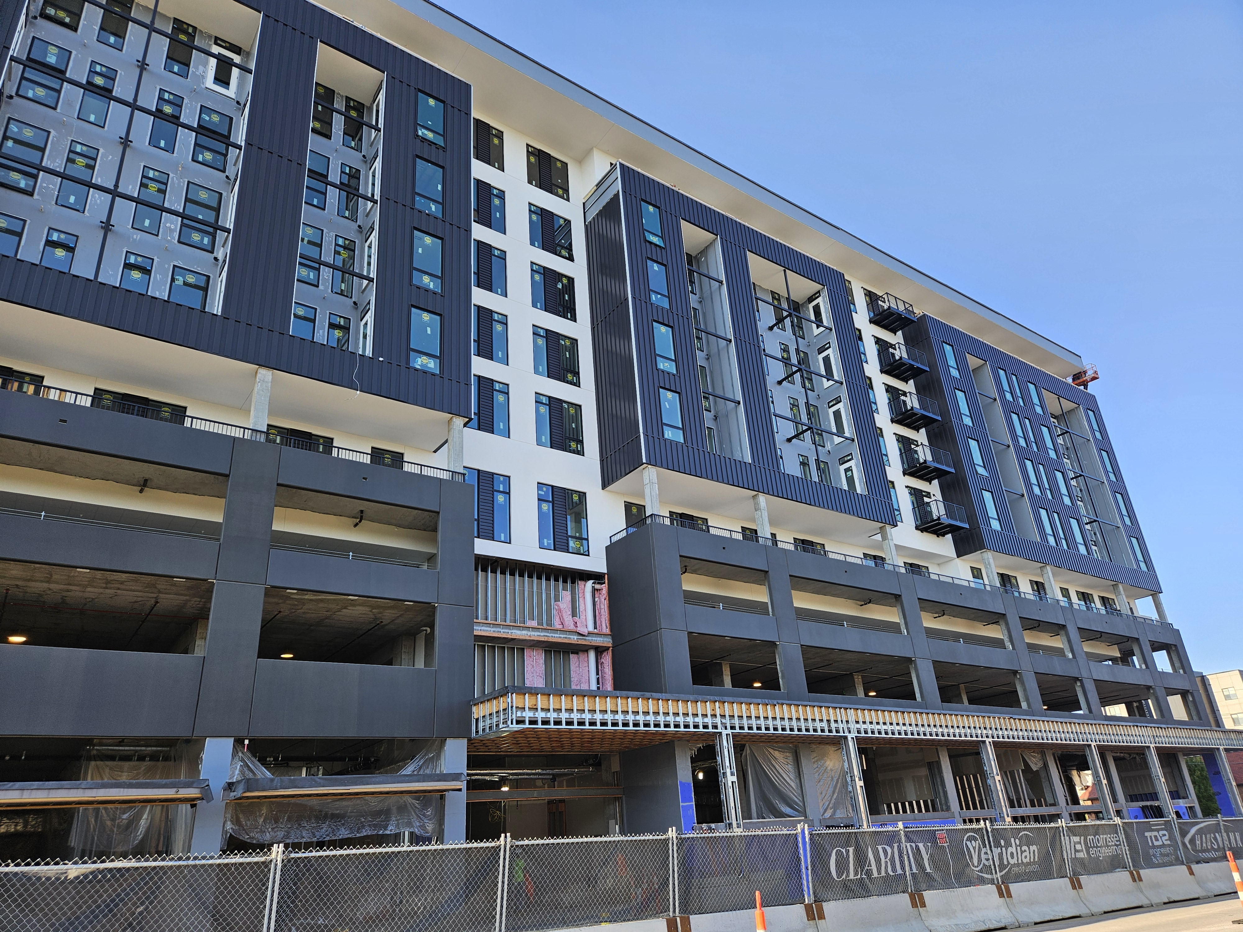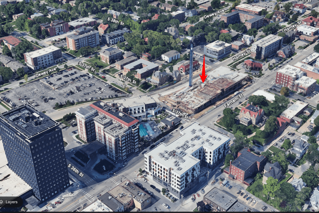 September 2024 Omaha Exploration photos of the 37 West Farnam apartments in progress. The picture on the left is from Farnam. The picture on the righ is from Harney.