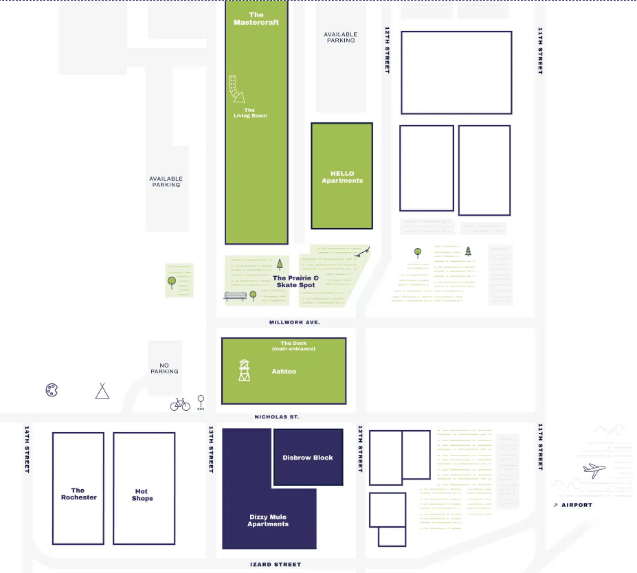 Already in the area was the Hot Shops which provides studio space for 90 resident artists. It also includes the Mastercraft building which serves as the home to 50 entrepreneurs and employing 300 people. Just to its east is the five story is the five story Hello Apartment complex at 12th and Millwork Avenue. Completed in 2022, it was built on on a long forgotten tract of land that was the E. E. Naugle Company Cedar Block Saw Mill and Yards in 1890. The 171-unit apartment complex provides a combination of studio, one and two bedroom units.