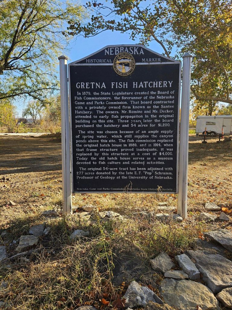 The Gretna Fish Hatchery became Schramm Park after University of Nebraska at Lincoln Professor of Geology Eck “Pop” Schramm donated 276.7 acres of adjoining land to the Gretna State Fish Hatchery in 1937. Terms of the donation stipulated that the land would forever be used as a public park and be known as Schramm Park. It includes a geologic display with limestone, shale and marine fossils. The old fish hatchery building still stands and today serves as a museum.