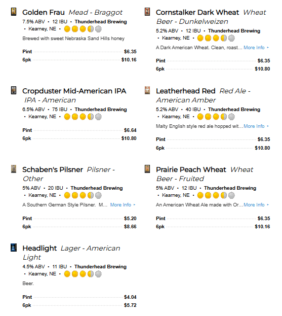 Thunderhead continued to grow and in 2006 it became one of the first breweries in the state to start canning its beer. Two years later they moved their brewing operations to nearby Axtell, Nebraska where they could continue to expand capacity. By 2019 they opened two locations in Omaha in addition to locations in Grand Island and West Point. While they would go on to close these locations, they remain one of the larger breweries in the state. Today they have taprooms in Axtell, Kearney and Wilcox.