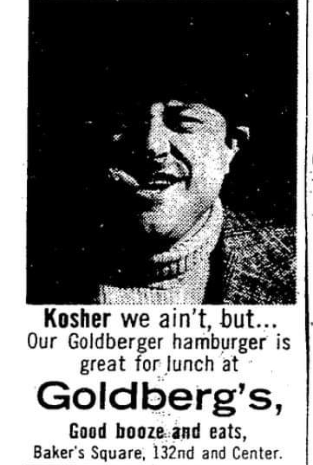 The name Goldberg’s was inspired by a pizzeria in New York City. As Dick walked down the street in NYC, he noticed a million Irish pubs but the one place that stood out was called Goldberg’s Pizzeria. So despite him and his partner both being of Irish ancestry, they decided to go with it stating, ““There are enough saloons named after the Irish so we figured we’d give the Jews a chance.” Early ads for the restaurant read “Kosher we ain’t, but… our Goldberger hamburger is great for lunch…”