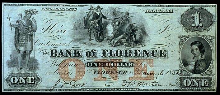 On the second floor of the bank was the office and lying quarters of its manager, James Monroe Parker. Banking practices in the west were lax to say the least so the Bank of Florence like other banks in Nebraska at the time printed its own money known as “wildcat currency” in denominations of $1, $2, $3 and $5. The bank’s funds were secured by loans which worked for a while until the Panic of 1857 hit and customers withdrew their money which drained all of the money that was in the vaults. The bank continued for a while before finally closing in 1859 after its owners returned to Iowa.