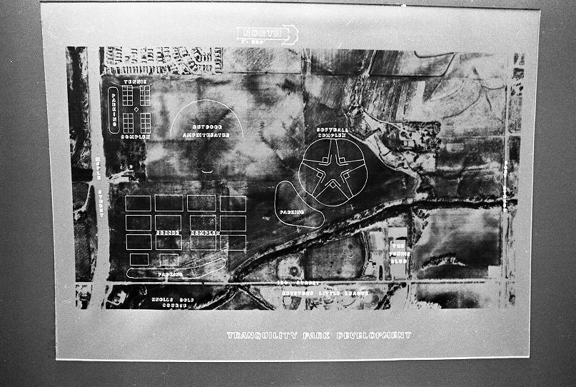 The idea for a new park in northwest Omaha at 120th and Maple Streets came about in 1967. At the time, it was all cornfields. The city started condemnation proceedings on the property that same year. It was named Tranquility Park in honor of the first moon landing that took place in 1969. The original proposal called for a lunar observation post with telescopes and a lake though it seems they were later dropped, perhaps due to the higher-than-expected costs to obtain the land through eminent domain. Apollo 13 astronaut John Swigert Jr. was present for the dedication of the park on June 21, 1970.