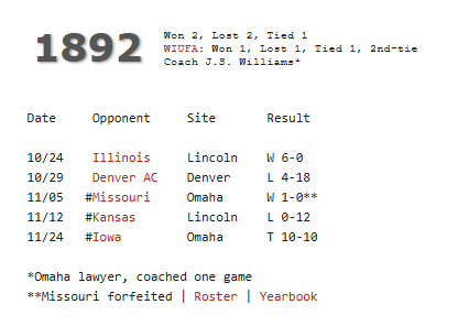 Today we continue our offseason exploration of Nebraska football. If you missed the prior post, you’ll find a link to it down below. Nebraska finished its second season with mixed results. Despite two wins against Doane and a second state championship, it recorded it first ever loss to an out of state rival – Iowa.