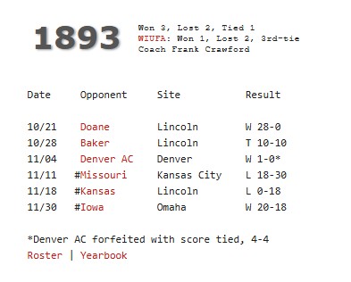 Interestingly, Crawford played his former team from the season prior – Baker- in its second game. Also in Lincoln, the game ended in a 10-10 tie. One newspaper account claimed that Nebraska was denied a win due to the Baker fullback who also served as umpire. On two different occasions, he undeservedly awarded the ball to his team after fouls.