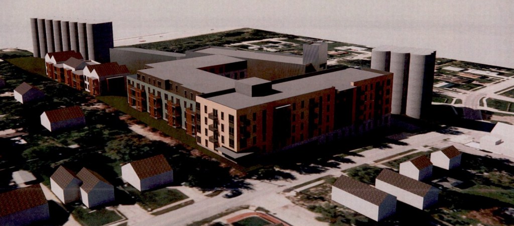 The silos closest to the interstate will remain while those closest to Vinton Street appear to be incorporated into the design and even utilized as part of a swimming pool. The upper portion of the silos that sit in between will be razed and replaced with two apartment buildings. A third apartment building and town houses will be built along 34th Street. The complex named The Silos and led by Lite Development and Leo A. Daly will have 225 apartment units and eight town homes. It will also include 244 off-street parking stalls.