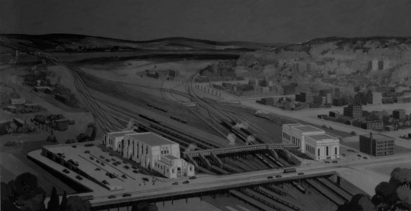 1929 Durham Museum drawing of Omaha’s two former train stations with Union Station on the left and Burlington Station on the right. Neither of these serve Amtrak today.