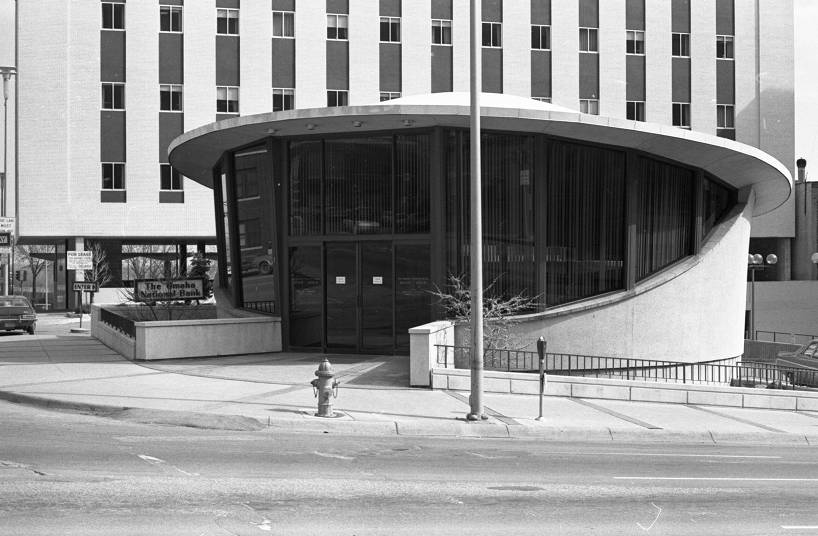 The saucer was constructed on a former parking lot for Omaha National Bank at a cost of $400k in 1968. It had seven or eight drive thru windows each serviced by a teller via closed-circuit television instead of having one assigned to each window.