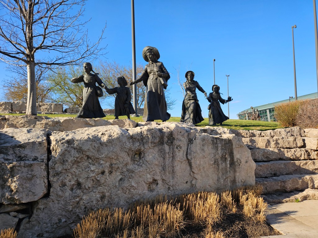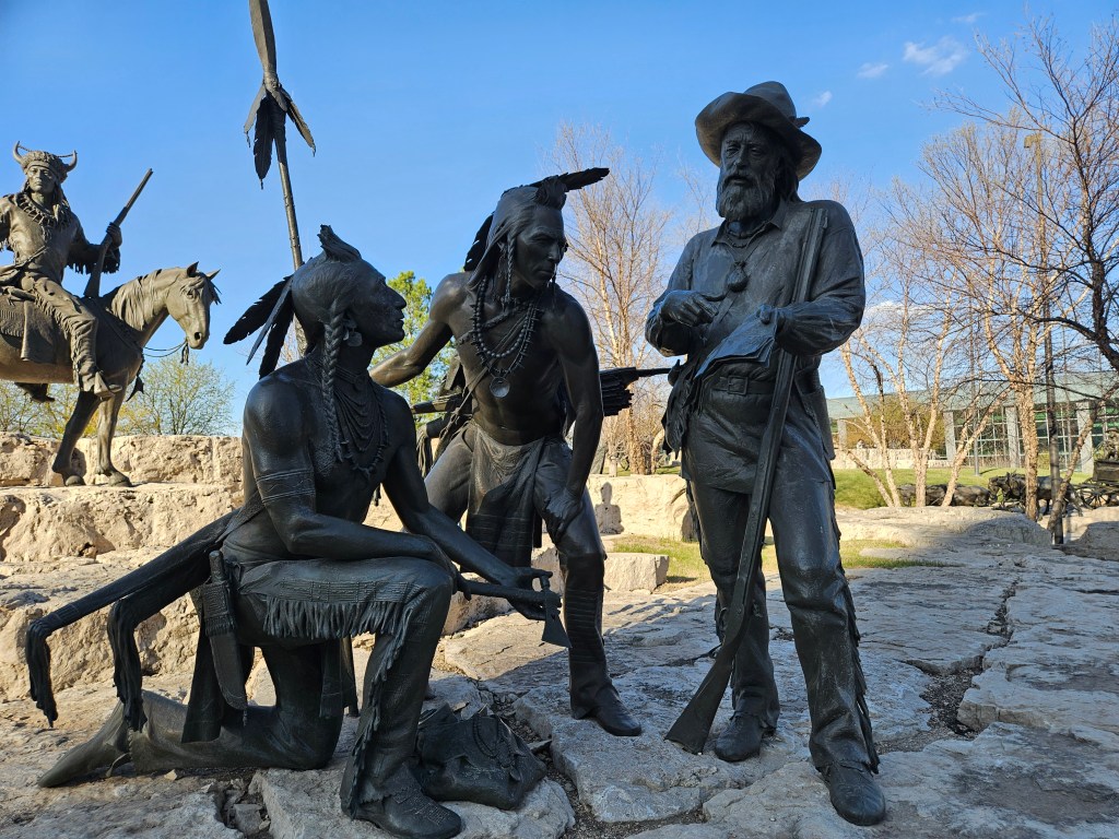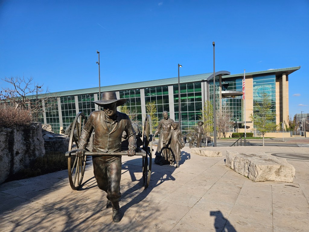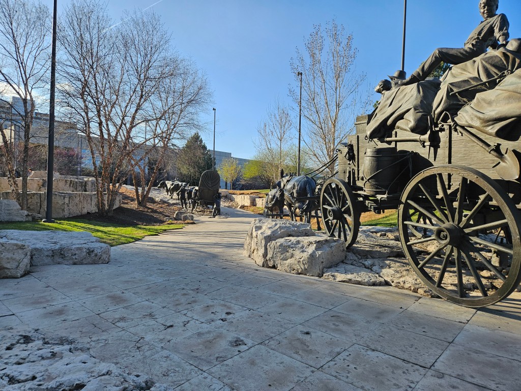 The first phase of the project was completed in 2002 with new pieces being added periodically. This includes a frontiersman asking three Native Americans for directions in 2019 and most recently in 2021 a Mormon family transporting their belongings using a pushcart rather than a wagon. Many of the Mormons heading west didn’t have mules or oxen so they resorted to pushcarts and similar items.