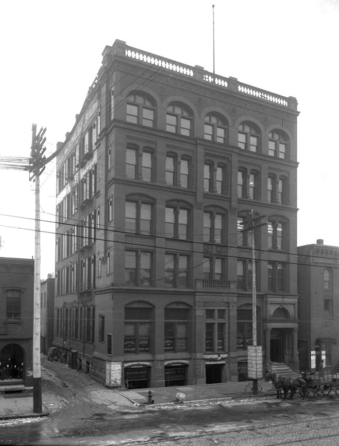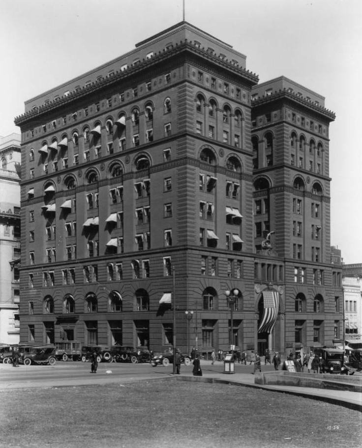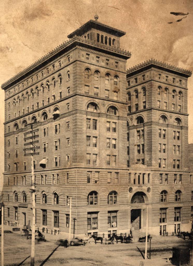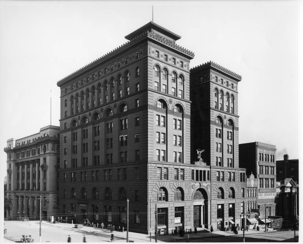 Built for New York Life Insurance, it has a twin that still stands in Kansas City. The design borrowed from Italian palazzos and incorporated features from the Renaissance Revival style. The H-shaped building has two towers made of brick and terra cotta and an elaborately detailed cornice on the 10th floor. The two towers stand on either side of an arched entrance of rusticated granite. A third tower capped by an Italian loggia is situated behind the entrance and rose above the other two.