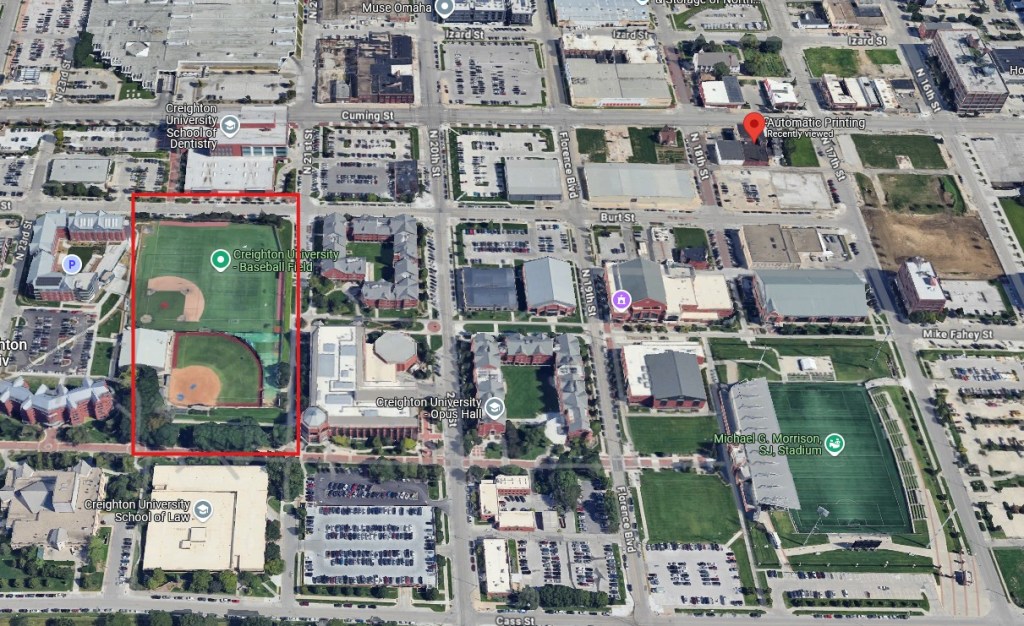 It will be built atop of where the current baseball practice and softball fields are located. Work will begin after the College World Series. I previously posted about the new baseball and softball fields that are currently under construction near 17th and Cuming Streets. Both Automatic Printing Company and Grace Tabernacle Church will be saved.