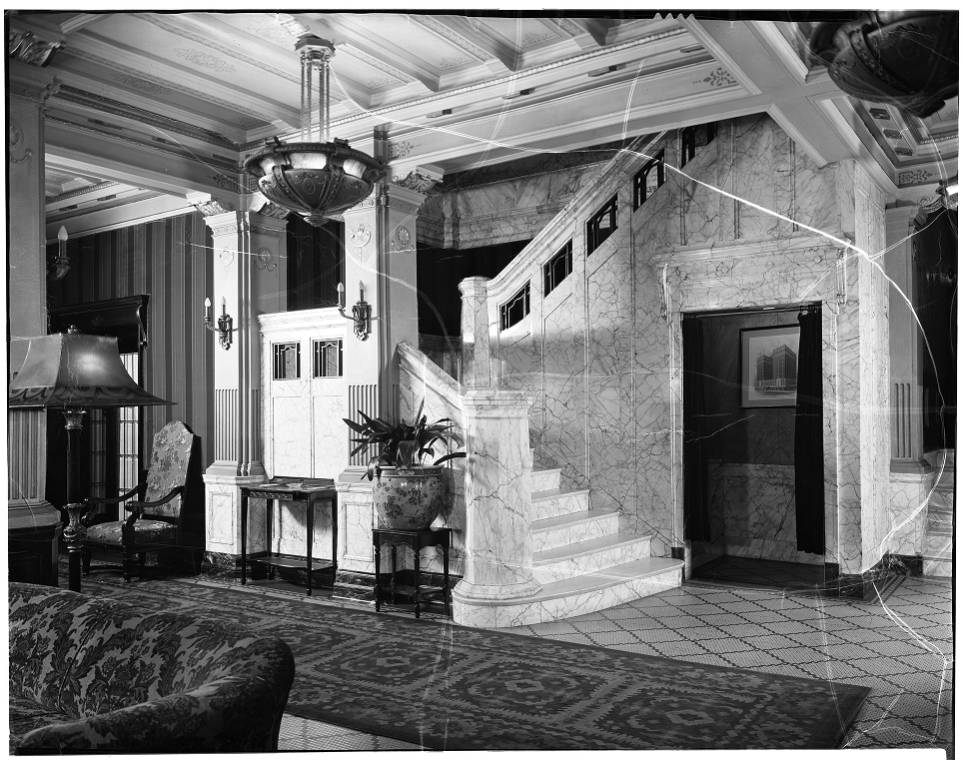 The interior was appointed with numerous ornate furnishings. The first floor had a grand marble staircase, dining room, kitchen, waiting room, writing room, palm room, lounge, soda fountain, cloak room, office and restrooms. The basement included a billiards room, smoking room, barber shop, shoeshine parlor, ladies hair salon, storage, laundry and servants quarters.