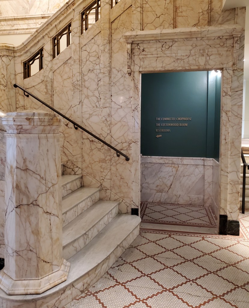While they retained some of its original features including the mosaic tile floor and marble staircase, other features required the use of old photographs so that they could be recreated. That includes the renovation of the ballroom on the top floor and the Cottonwood Room cocktail lounge in the basement which once again features its namesake tree and panoramic screen of the river valley. Other historical touches included the terrcotta columns out front and the check-in desk.