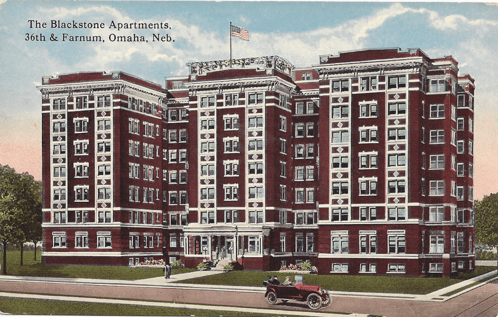 Considered to be the most elegant hotel between Chicago and San Francisco, the Blackstone Hotel at 302 S 36th Street was built in 1916 by Bankers Realty Company. The eight story building was designed by architect Francis W. Kirkpatrick, an assistant to Henry Ives Cobb who designed Chicago Federal Building.