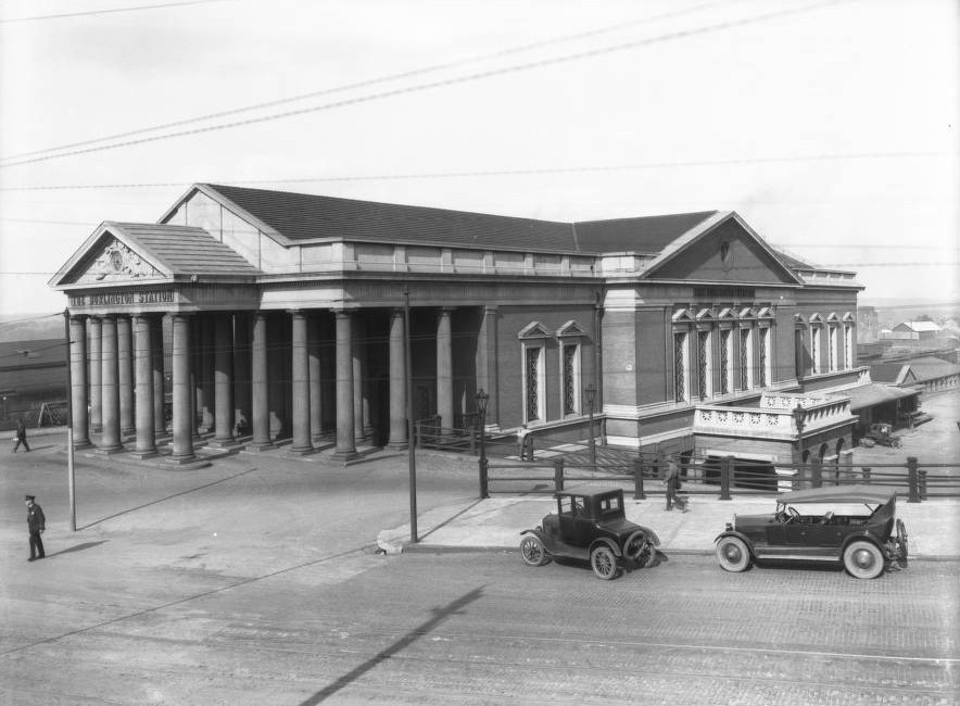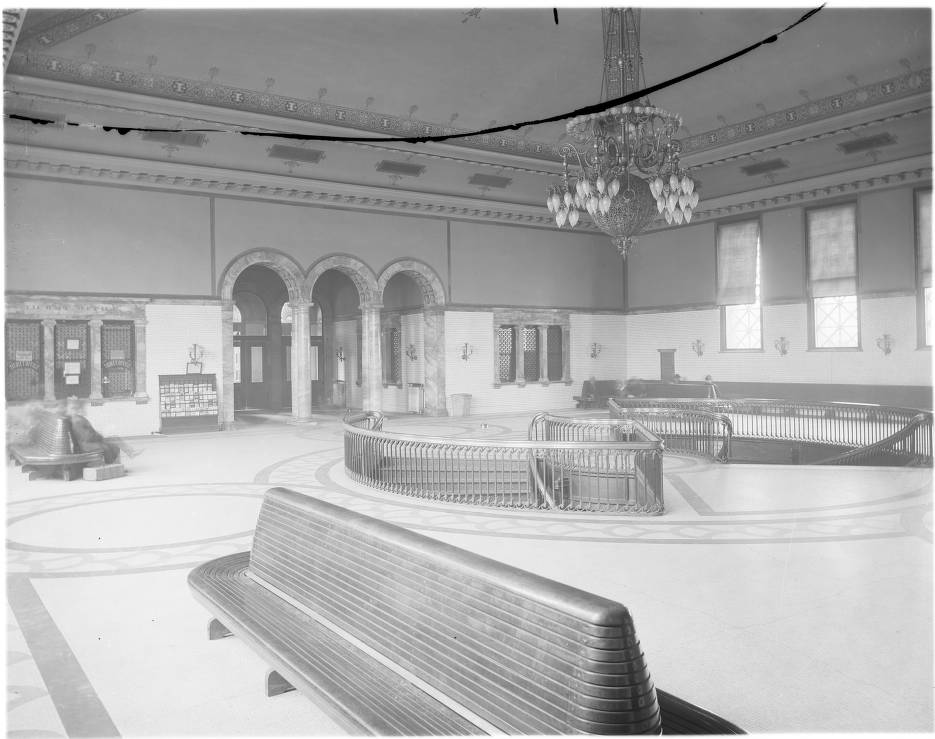 The iconic structure was designed by architect Thomas R. Kimball in the Greek Revival style. It replaced the original train station built on the same site in 1870. The exterior was made of light gray limestone, and the roof was covered in glazed red tile. The building featured 28 marble columns and mosaic floors, along with a large ornamental clock mounted atop a globe. Flanking the globe were figures representing manufacturing, agriculture, industry, commerce, steam, electricity, enterprise, science, art, and literature. In addition to waiting rooms, the station offered a lunch counter, offices, smoking room, and many other amenities. A grand circular staircase accented with bronze castings of Rocky Mountain sheep heads led passengers to the track level, where they boarded trains beneath a large canopy.