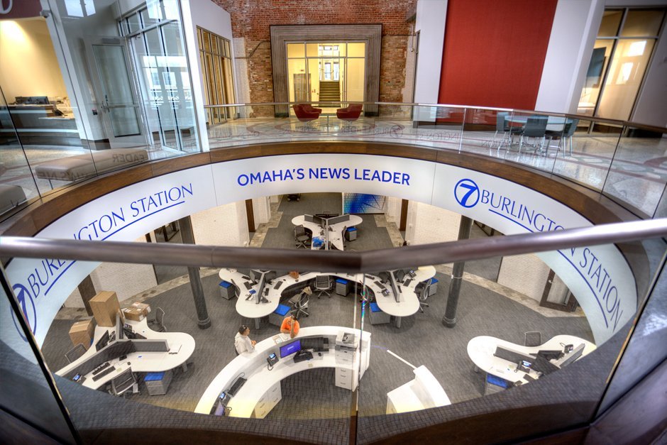 In 2013, KETV announced an ambitious plan to transform Burlington Station into its newsroom, ultimately saving it from demolition. The news station sought not only a larger space but also the opportunity to preserve a historic landmark. Led by Leo A. Daly and Lund-Ross Constructors, the $22 million project restored the building’s exterior to its historic appearance while outfitting the interior with modern broadcast technology. In 2017, the Great Plains Chapter of the National Railway Historical Society honored KETV, Leo A. Daly, and Lund-Ross Constructors with the John H. Conant Award for their efforts in preserving American railroad history.