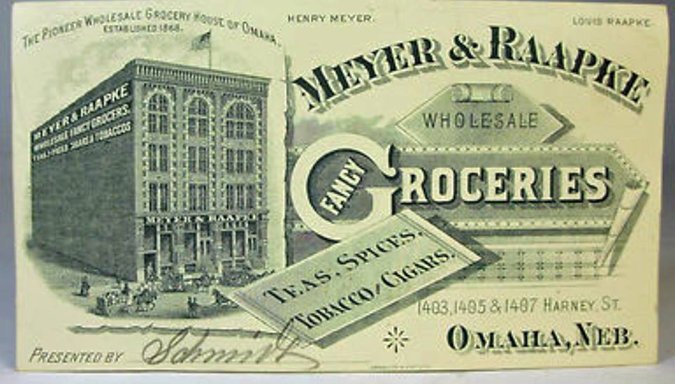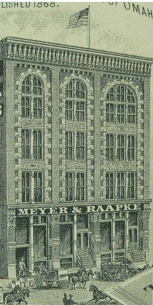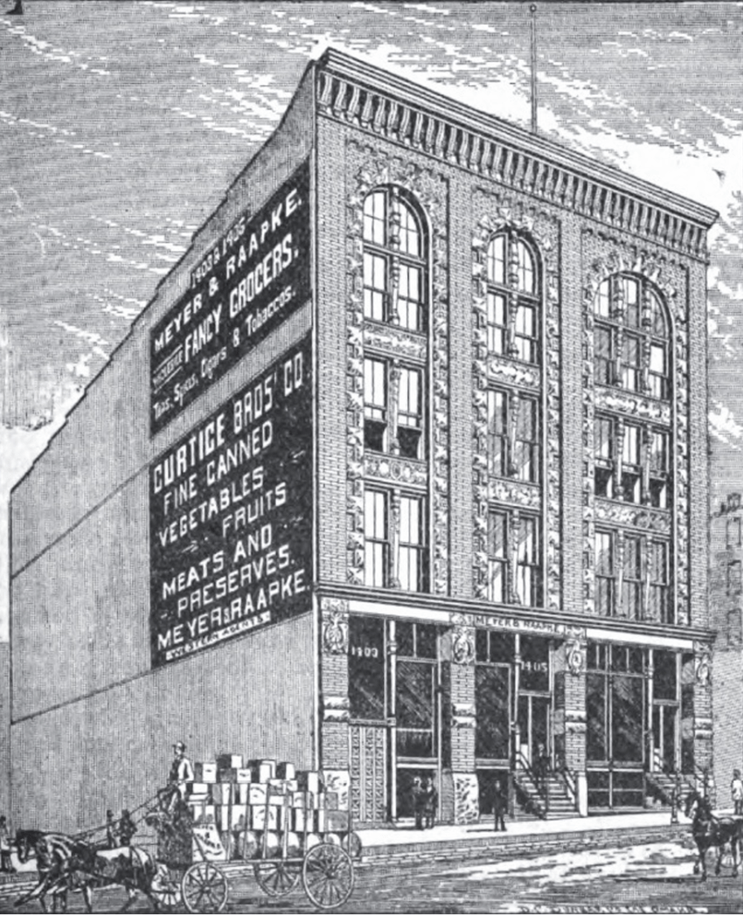 Founded in 1868, Henry Meyer and Louis Raapke were among the first—and few—to move from the retail grocery business to wholesale. Originally located at 9th and Douglas Streets, the company eventually required more space. Larger than they needed at the time, Meyer & Raapke occupied the eastern side of the new building while leasing out the western side to generate cash flow and cover costs. The additional space also allowed room for future expansion.